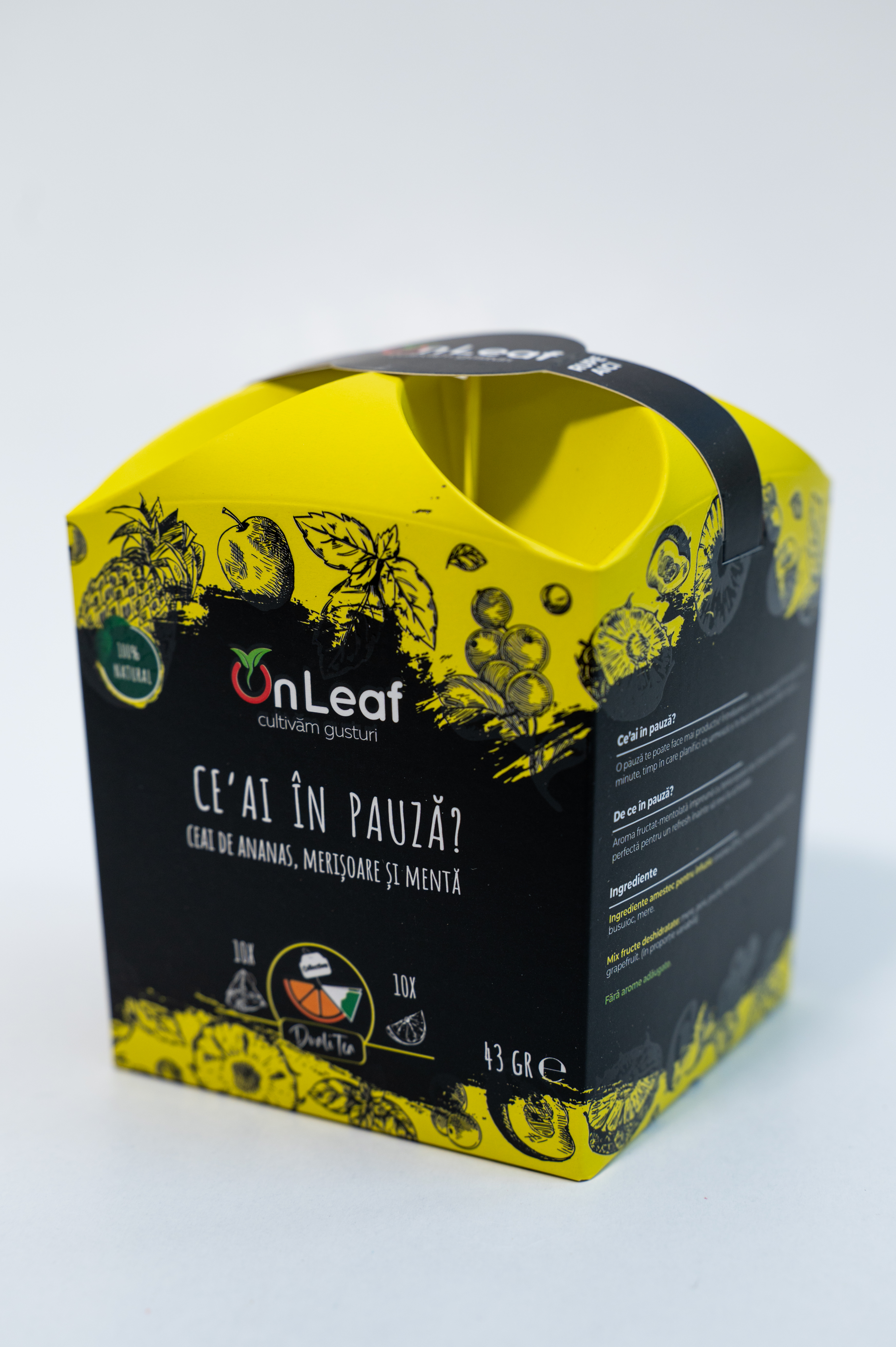 Cutia contine 10 plicuri de ceai si 10 fructe deshidratate.