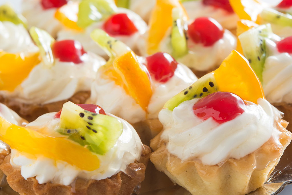 Ingrediente: frisca, crema iaurt, coji de tarta, fructe de decor (portocale, kiwi, afine, cirese confiate).