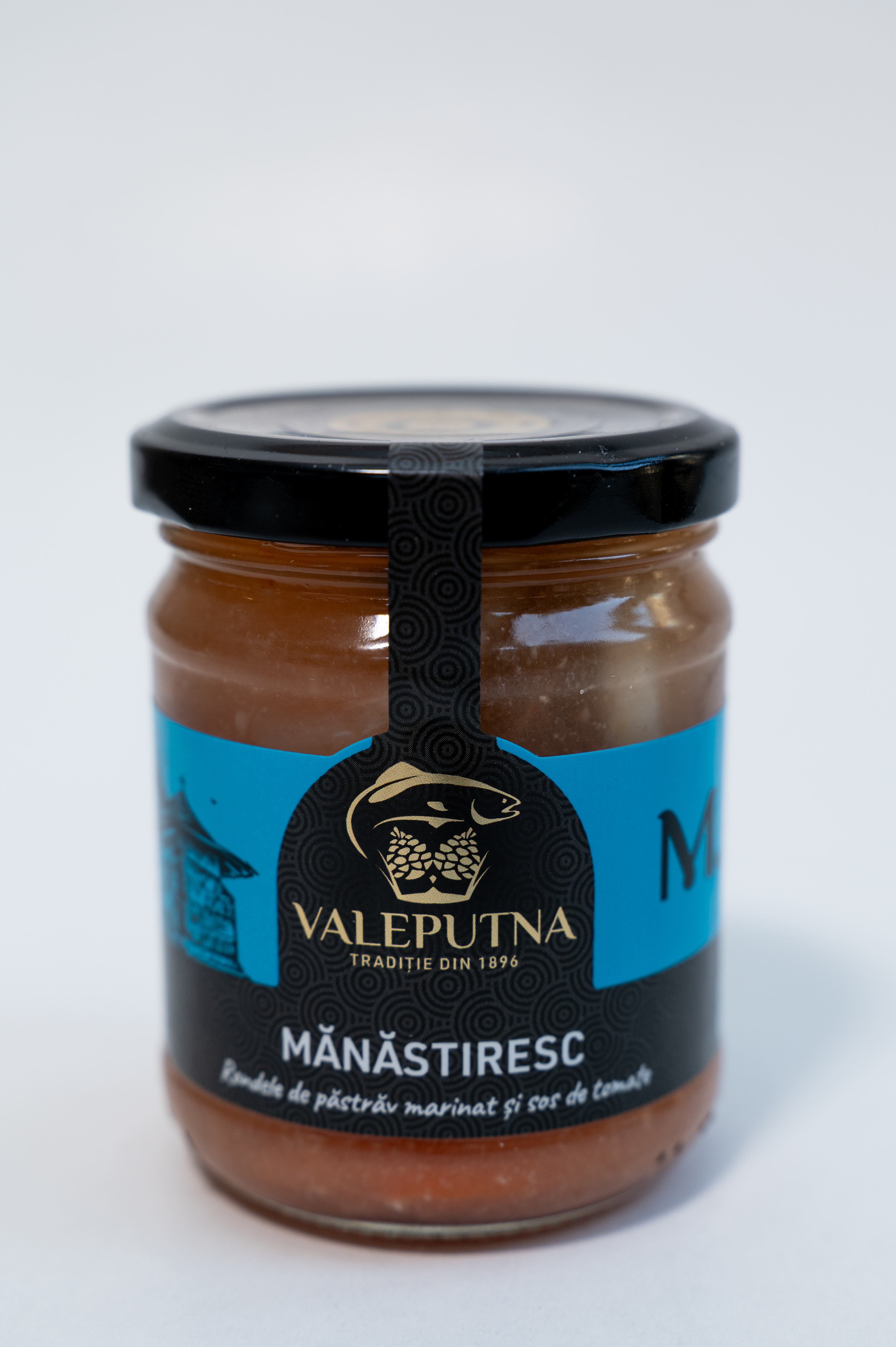 Ingrediente: rondele de păstrăv marinat (52%), sos de tomate (10%), ceapă, morcov, apă, ulei de floarea soarelui, oțet, vin, zahăr brun, foi de dafin, sare, piper.