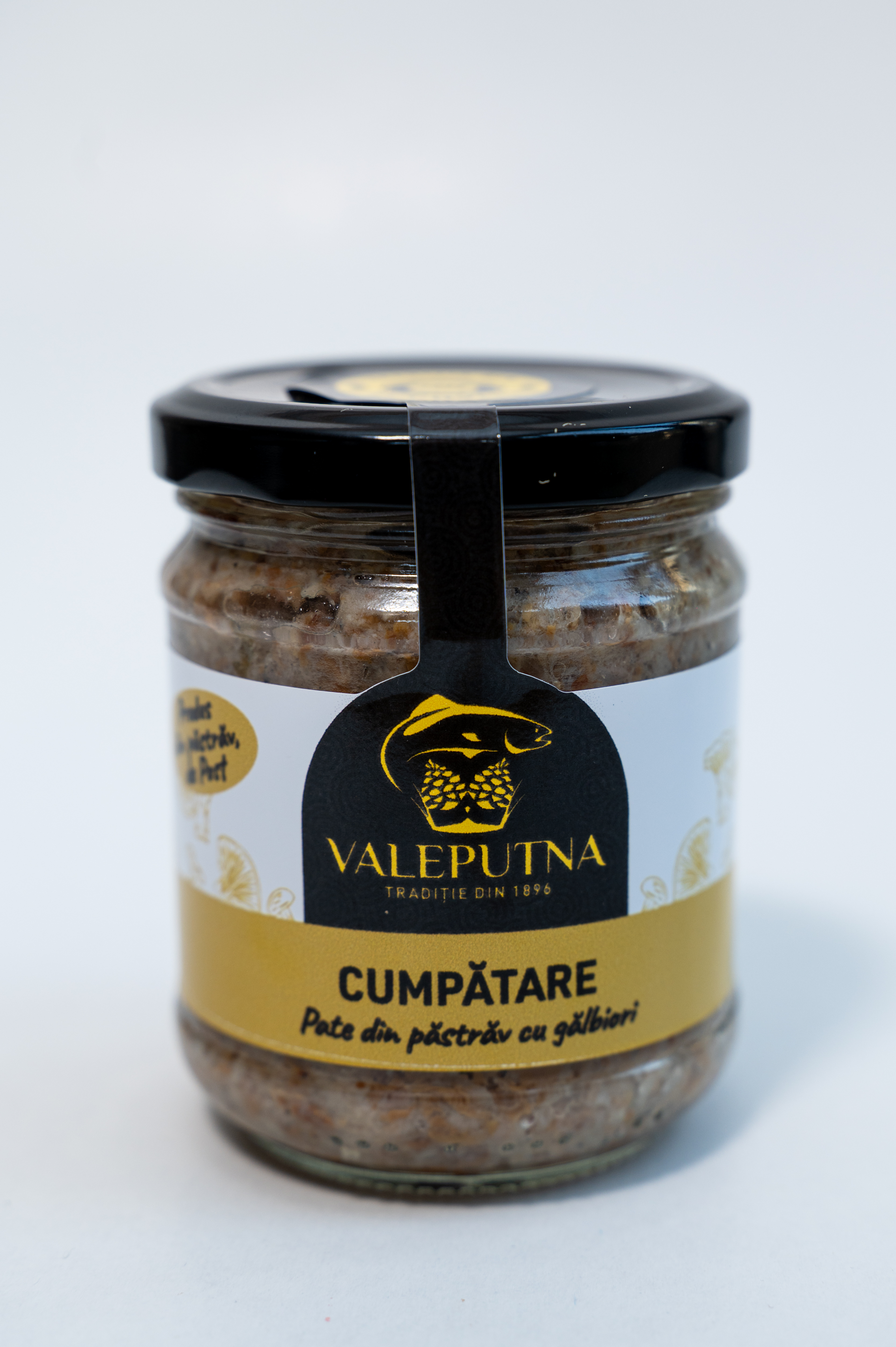Ingrediente: păstrăv fiert 26%, gălbiori 54%, vin, ulei de floarea- soarelui, sare, pătrunjel, usturoi, piper alb.